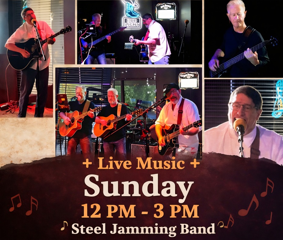 Catch Steel Jamming Band live at The Rhino Food & Spirits from 12PM–3PM for an afternoon of great music, cold drinks, and good vibes.